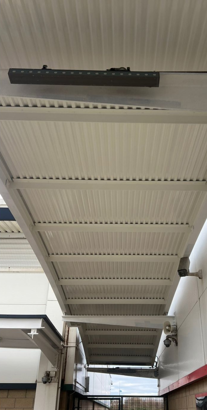 As part of a larger project we carried out steel canopy refurbishment work of this suspended canopy at a retail park in the West Midlands recently. Mould and organic growth had begun to develop. If left unchecked a build up of moisture would result in the breakdown of the protective coating. The moisture will in a short space of time attack the steel substrate beneath. This process needed to be halted to rescue the canopy from failure.